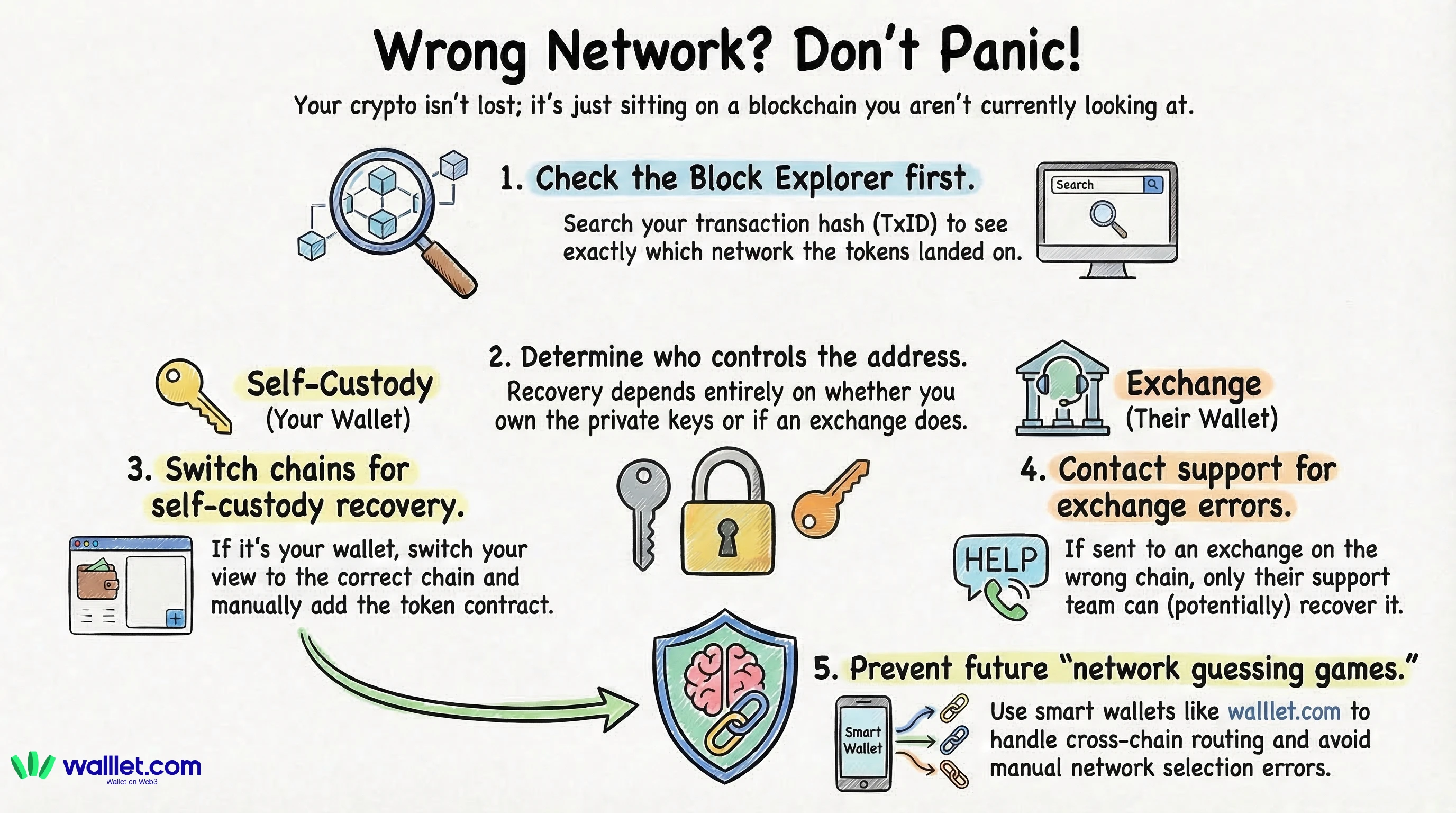 Before you try random fixes, confirm the chain on a block explorer. Then open walllet.com and use the safest route (swap or cross-chain move) that matches where your funds actually are.